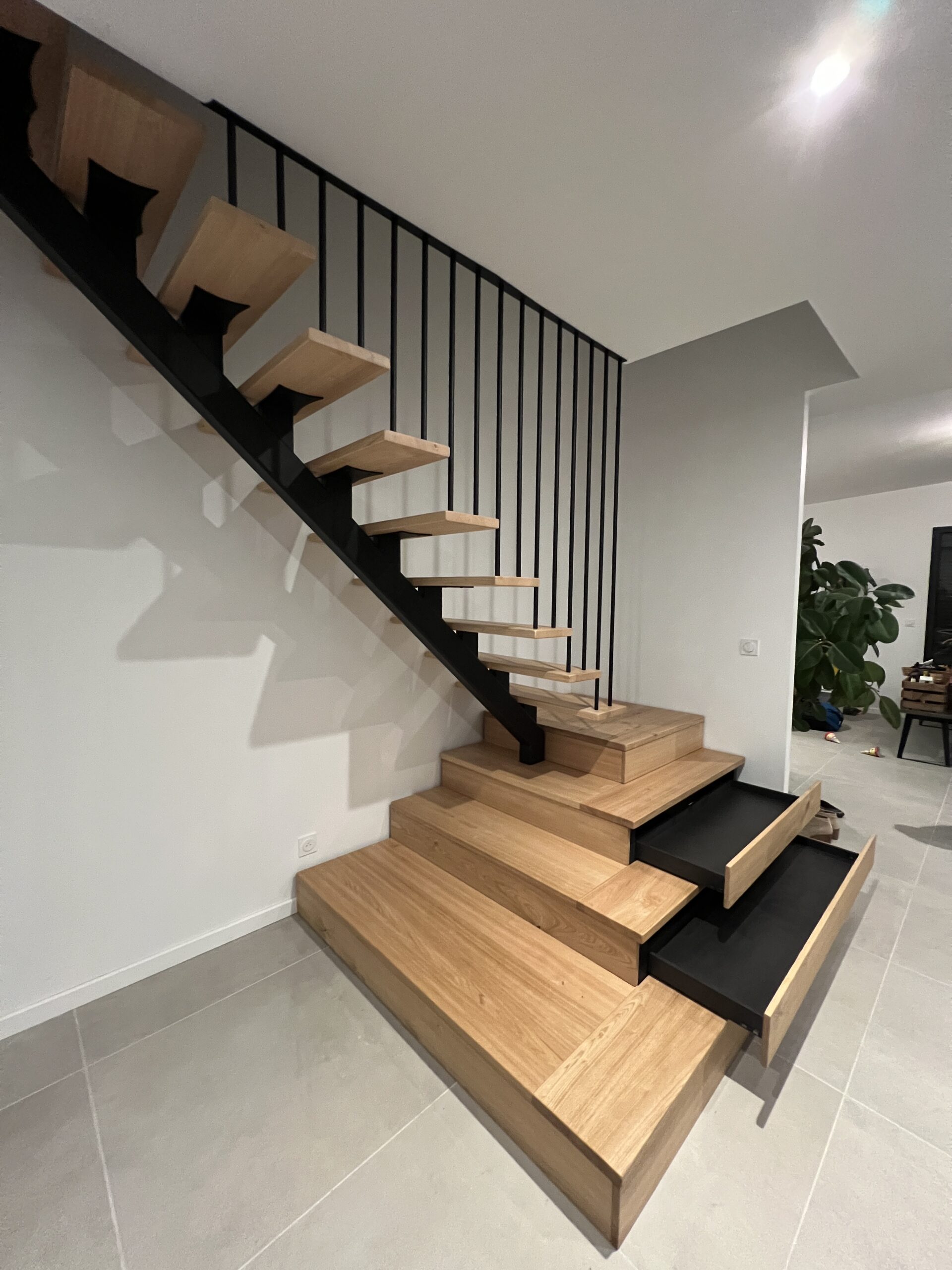 L’escalier n’est plus seulement un moyen de monter à l’étage, il devient un meuble à part entière qui structure votre pièce de vie. Pour cette réalisation située dans le secteur de Quimper, l’équipe d’Atelier Steel Concept a imaginé un ouvrage hybride, alliant l’esthétique industrielle à la fonctionnalité du mobilier scandinave.