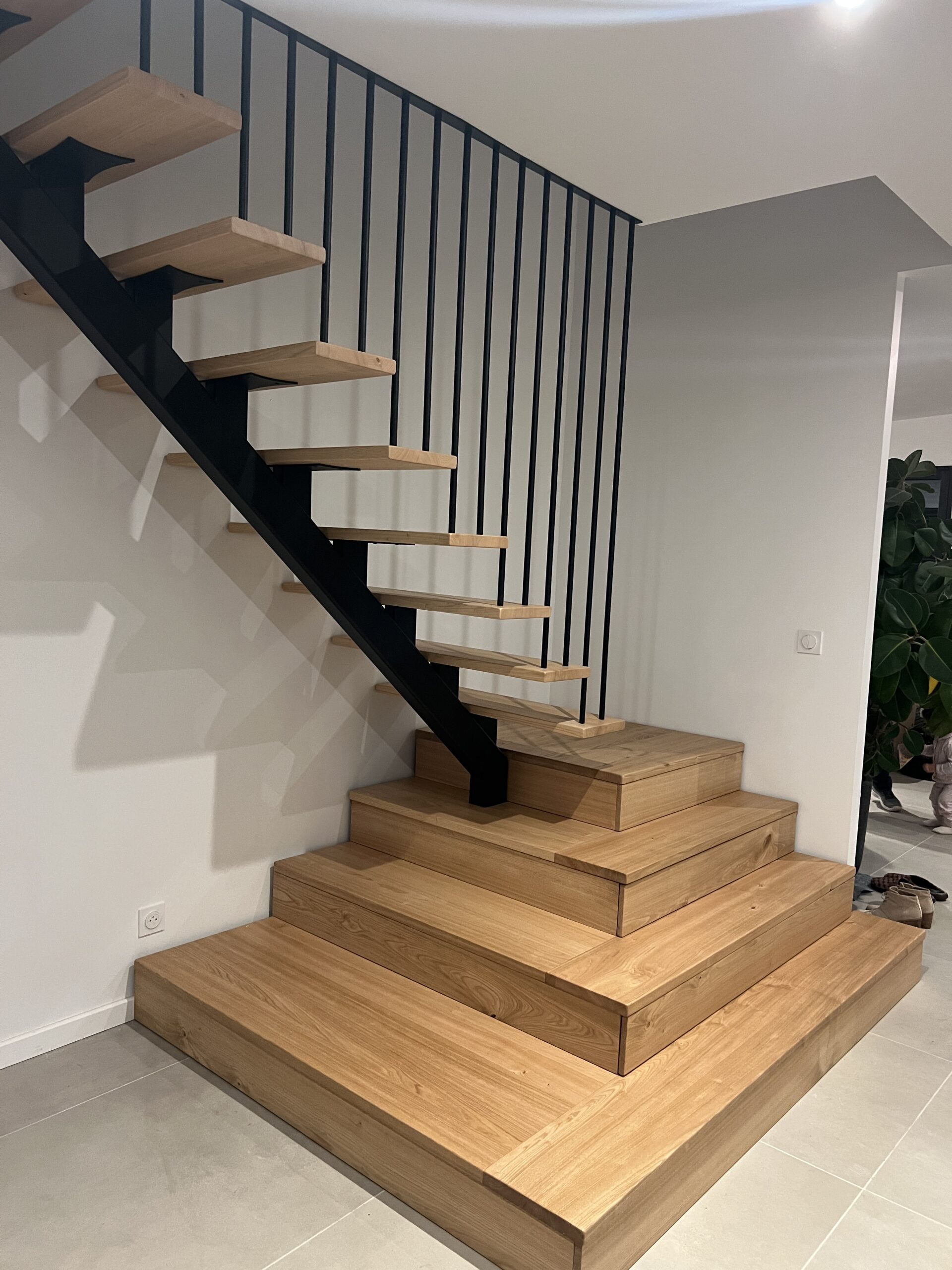 La structure portante reste fidèle à notre signature : un limon central métallique noir, discret et robuste. Il soutient les marches supérieures avec légèreté, créant un contraste saisissant avec la masse rassurante du podium en bois. C’est cet équilibre entre le « plein » du bois et le « vide » de la structure métallique qui donne tout son charme à cet ouvrage contemporain.