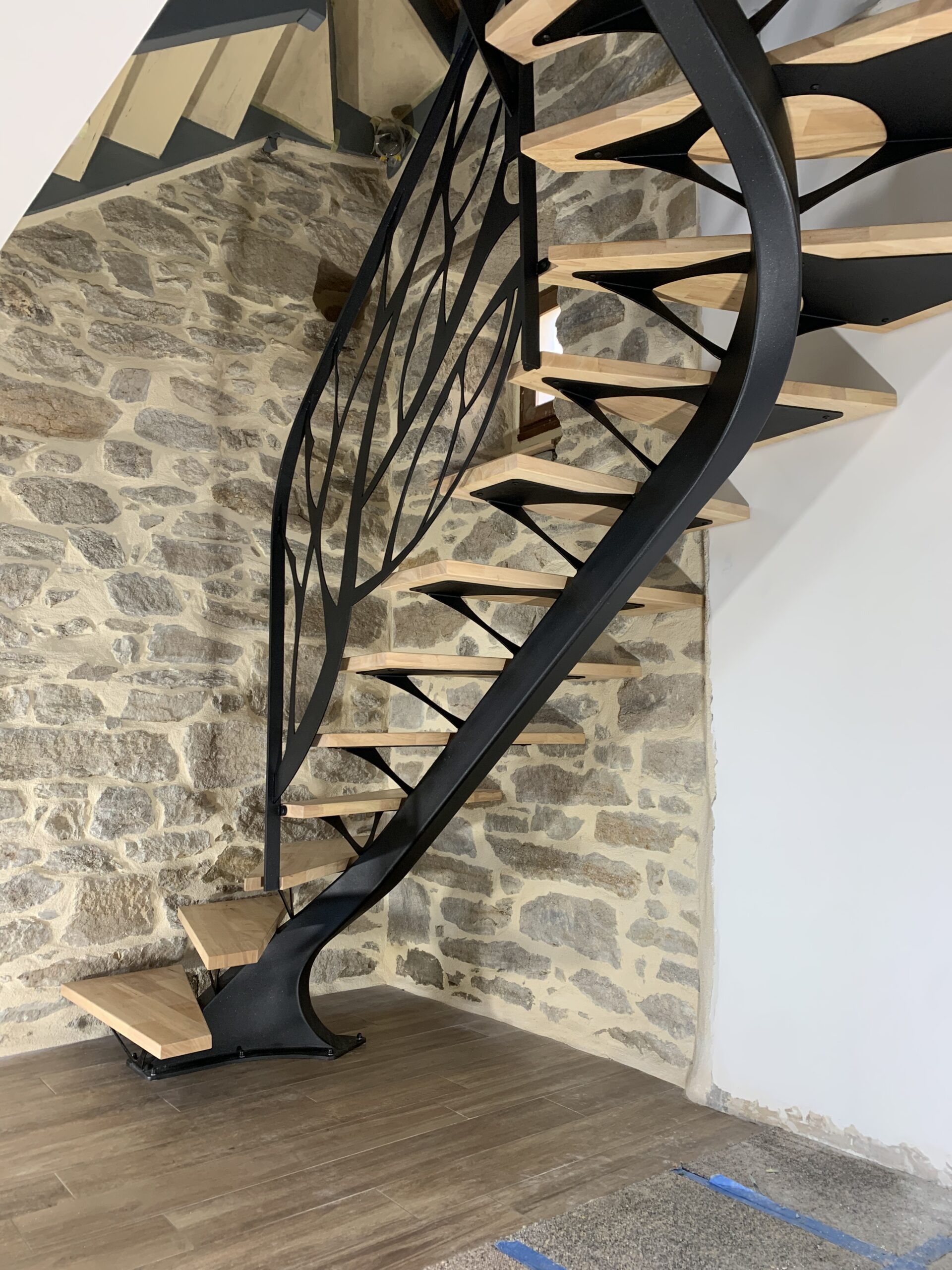 Le motif végétal, avec ses lignes organiques, rappelle la nature. Ainsi, il crée un lien doux entre la froideur du métal et la chaleur de la pierre. De plus, ce type de garde-corps assure une sécurité optimale. Finalement, il devient une véritable œuvre d’art au cœur du salon.