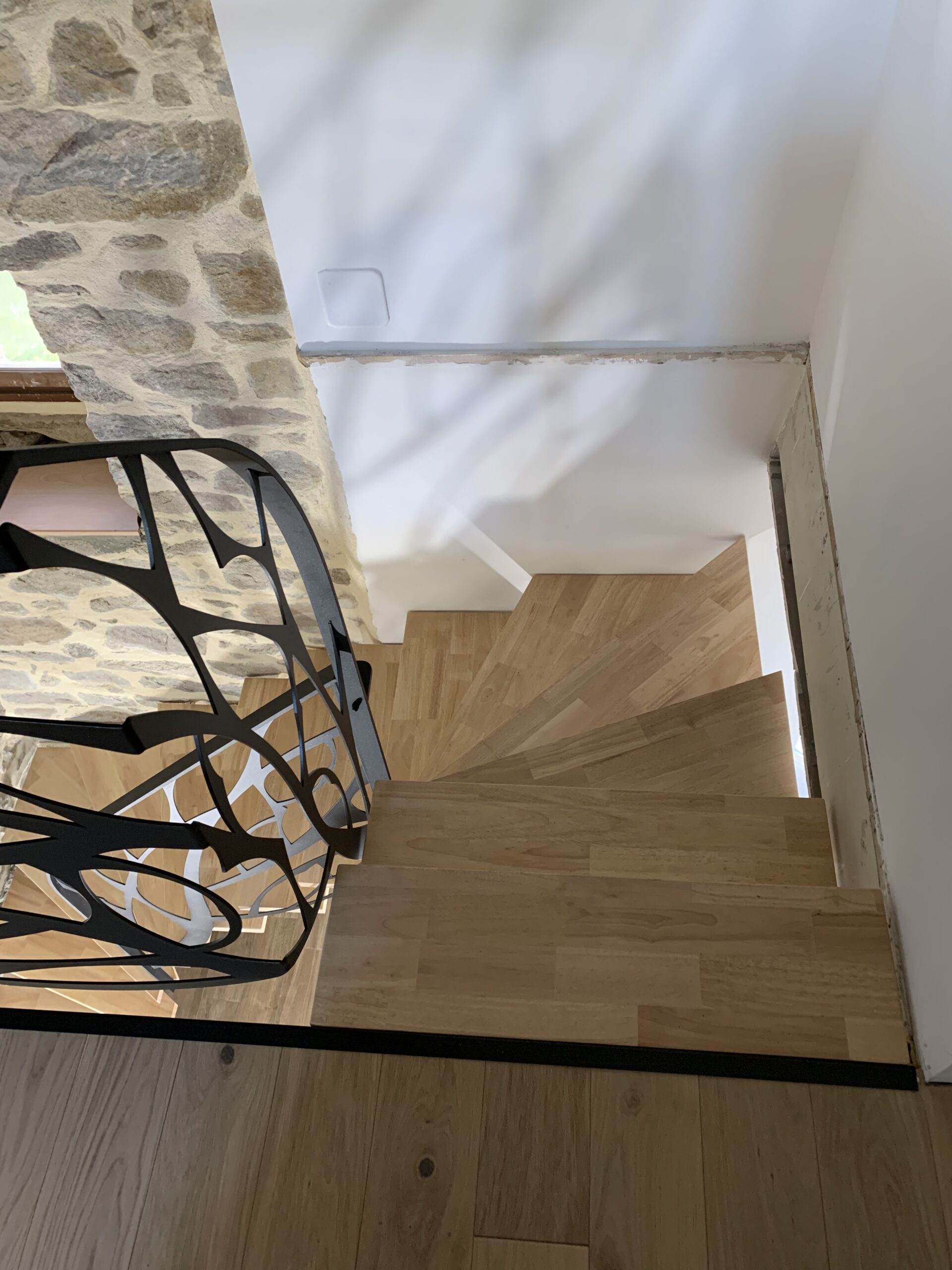Cependant, la pièce maîtresse de cette réalisation est sans conteste le garde-corps rampant. Plutôt que des barreaux classiques ou du verre, les clients ont choisi une personnalisation artistique. Cela est possible grâce à la découpe laser.