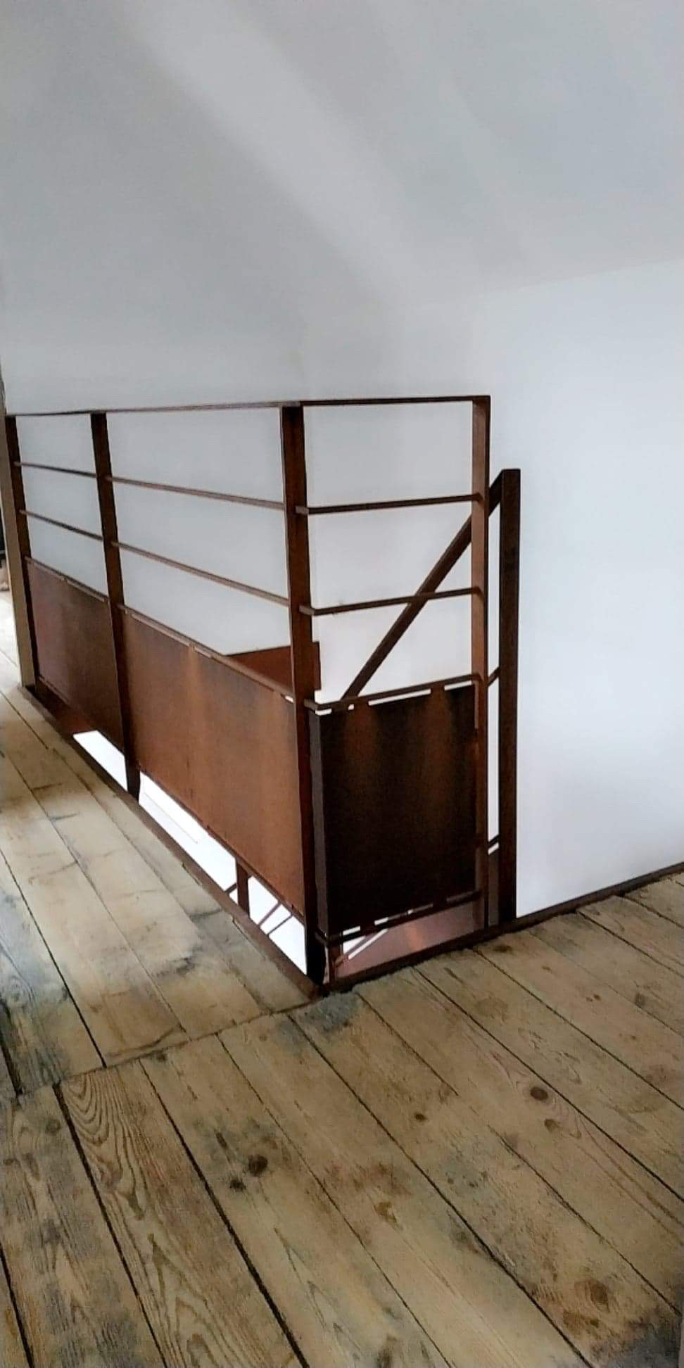 Pour ce projet, nous avons joué sur la matière brute. Plutôt que des barreaux fins, nous avons installé des panneaux pleins en acier avec une finition patinée type Corten ou rouille stabilisée. De ce fait, l’escalier devient une sculpture massive. Il s’impose comme l’élément central d’une décoration type « Loft« .